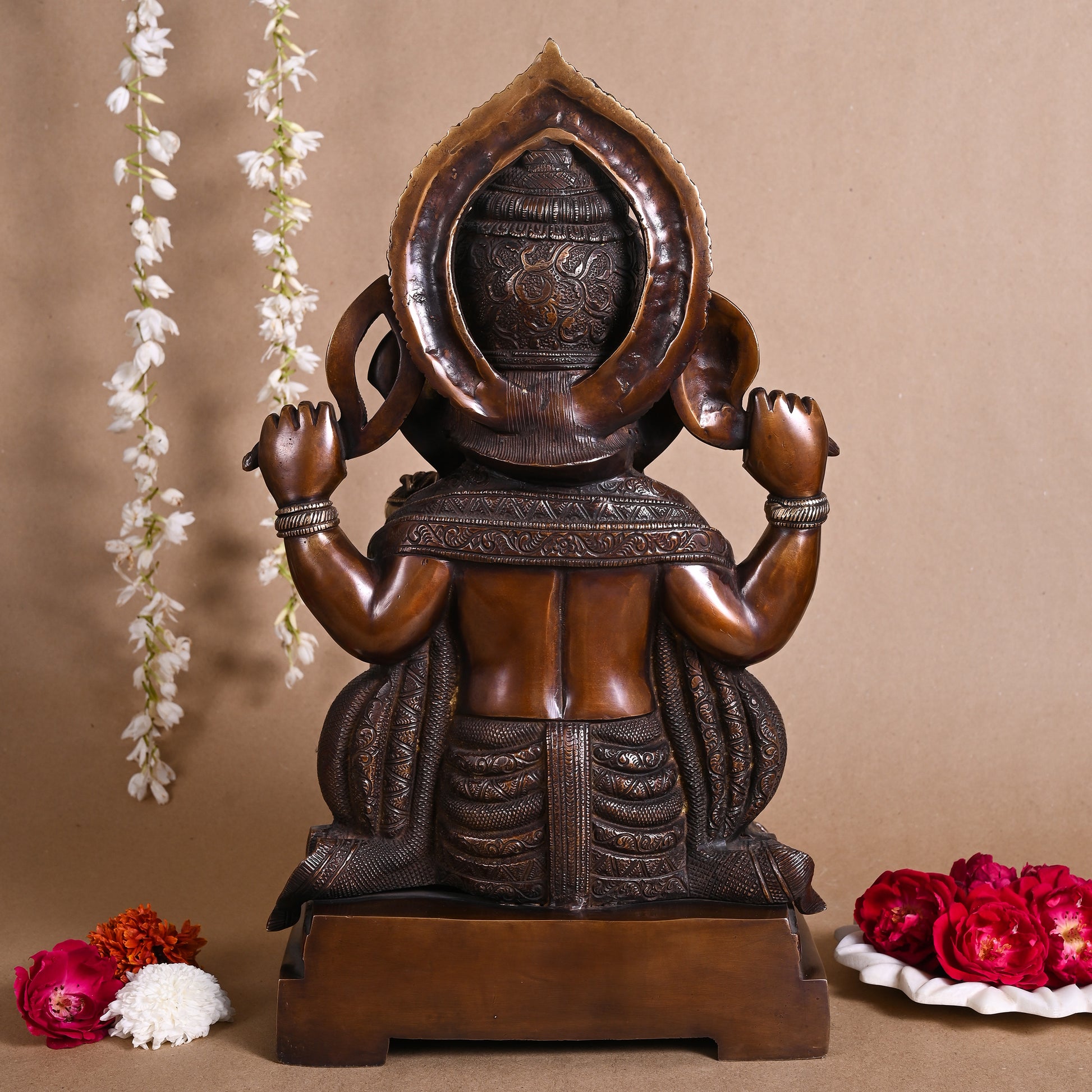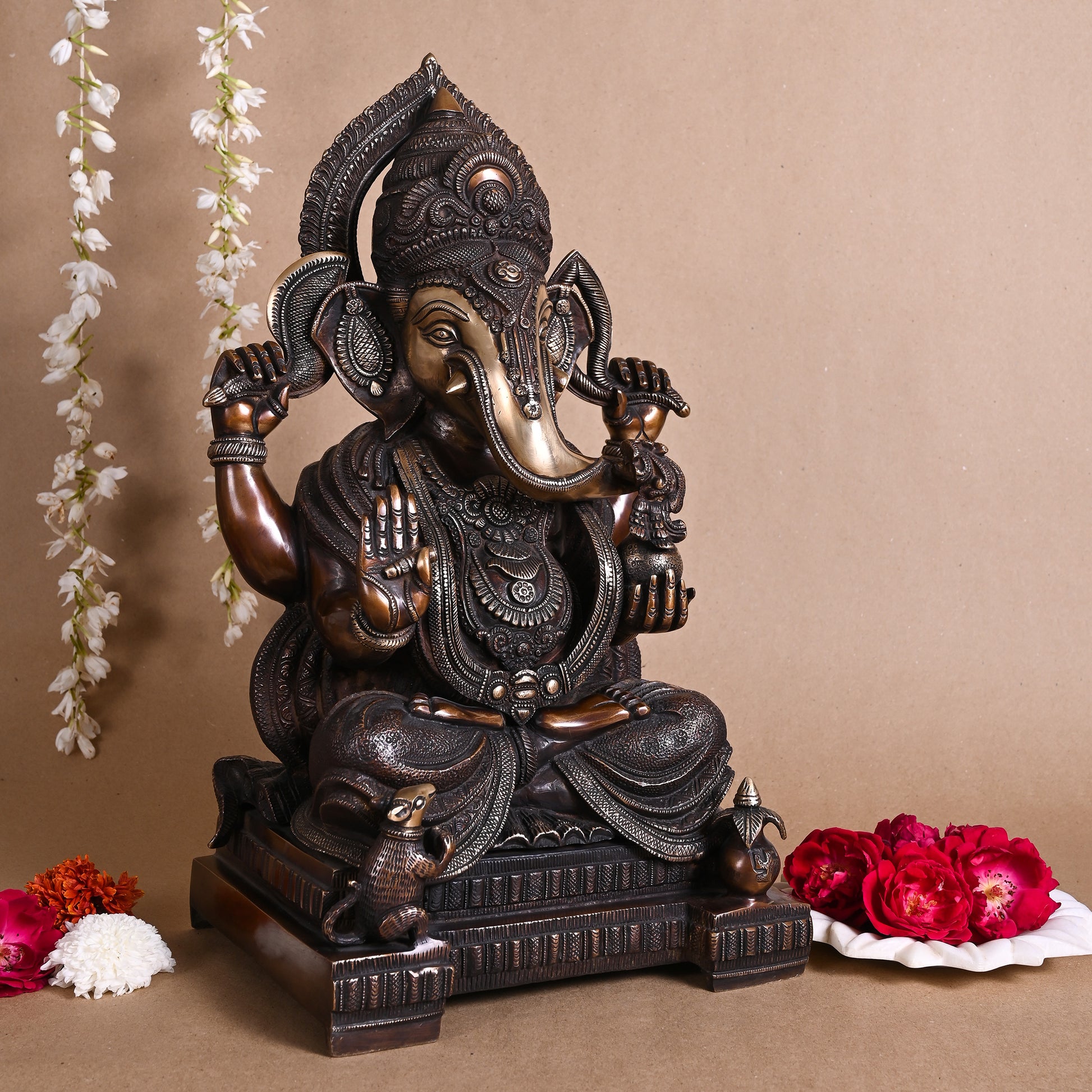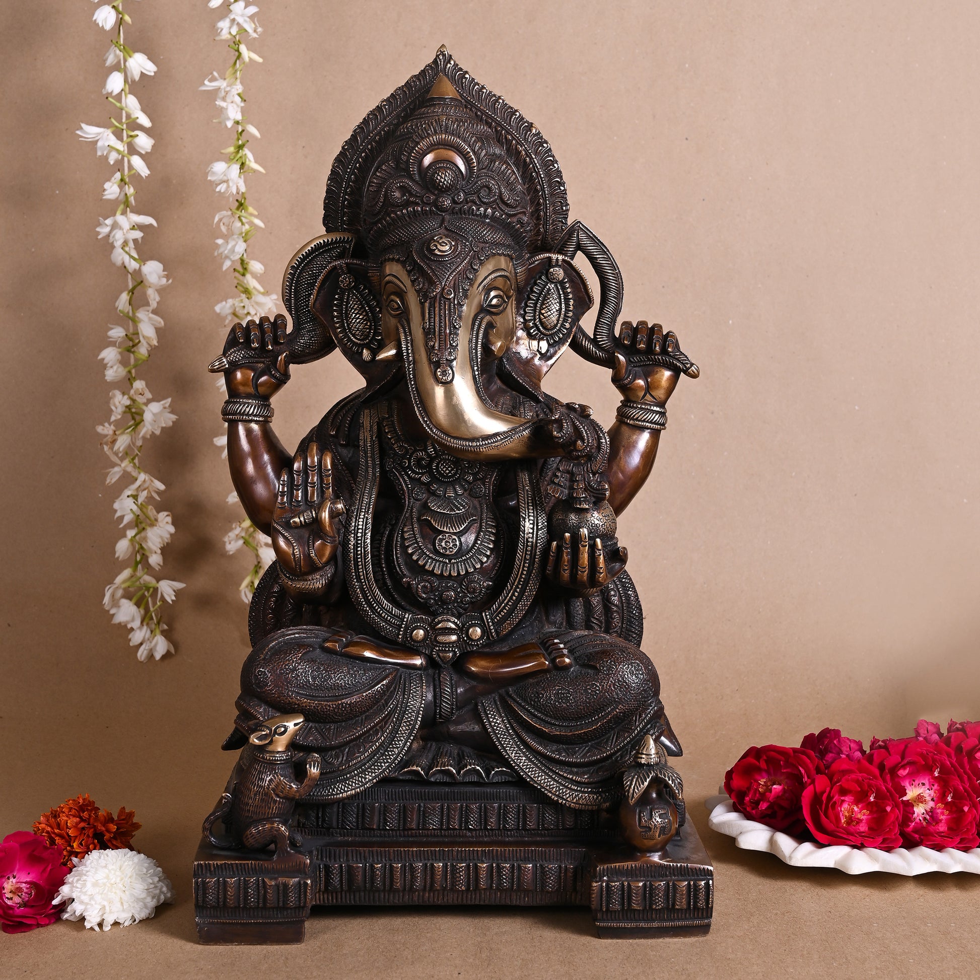 This stunning Brass Ganesh idol protects against the evil eye and dispels Vastu Dosha. He represents prosperity and good luck. Ganpati is Vignahrta, the remover of obstacles. Devotees worship him for intelligence and wisdom.This handcrafted ganapati murti from Suyogaḥ will invite knowledge, peace and happiness. Brass idols are best for worship and gifting to friends & family members.