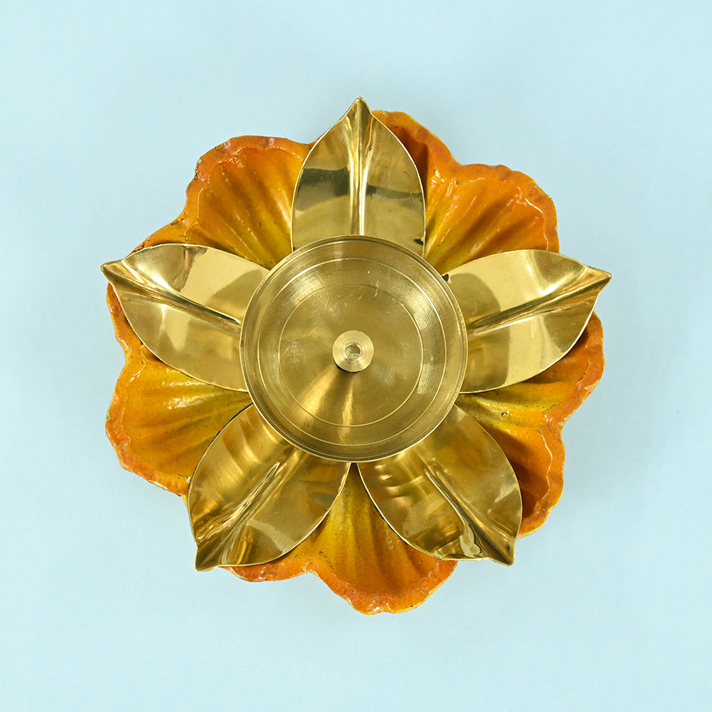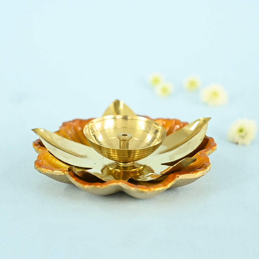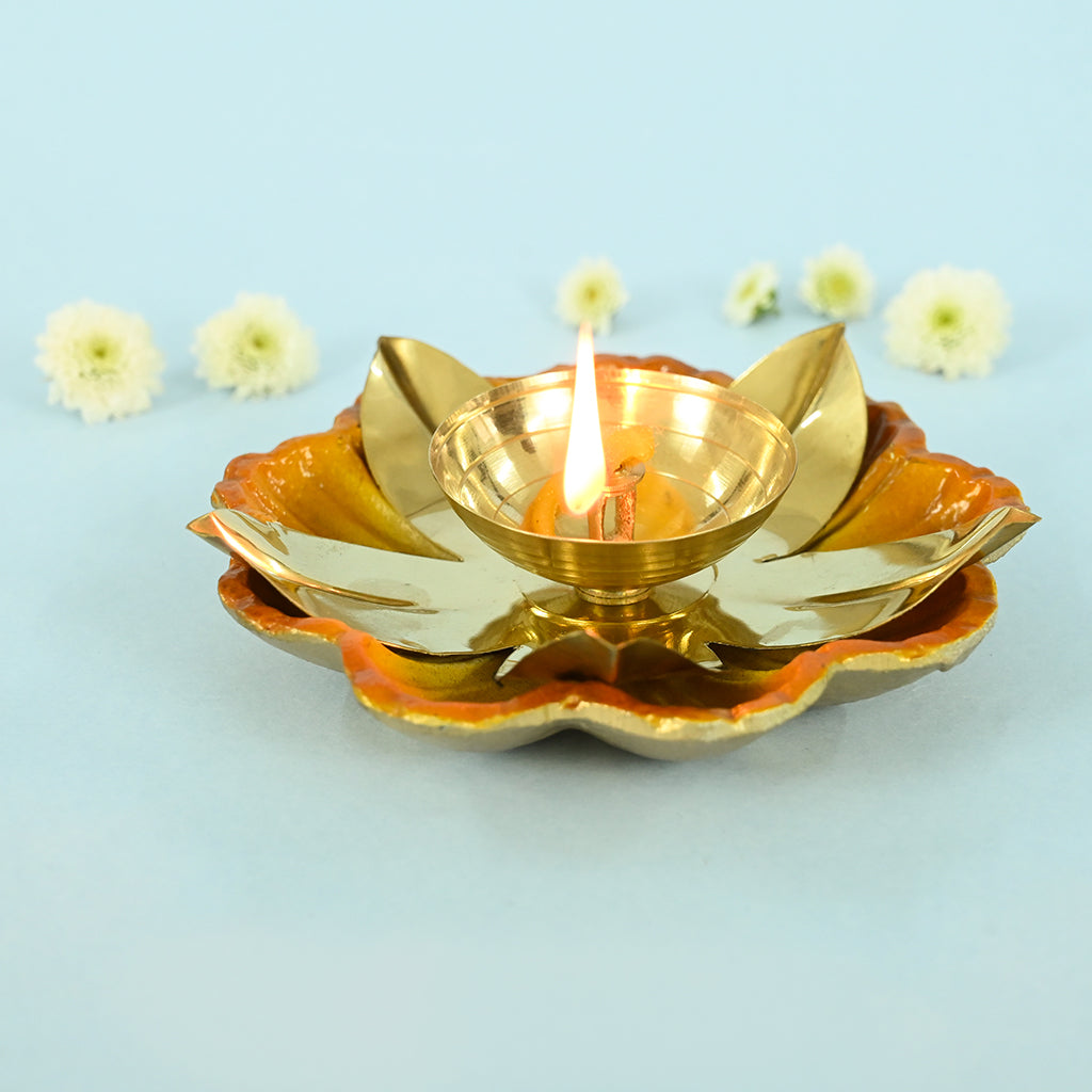 The Brass Colorful Flower Diya by Suyogah is a beautiful and unique piece of decor that combines traditional Indian design with modern aesthetics. The diya, or oil lamp, is crafted from high-quality brass and features a stunning flower shape with intricate detailing. The petals of the flower are painted in vibrant colors such as red, green, and blue, which give it a cheerful and festive appearance. The diya also has a sturdy base that keeps it stable on any surface.