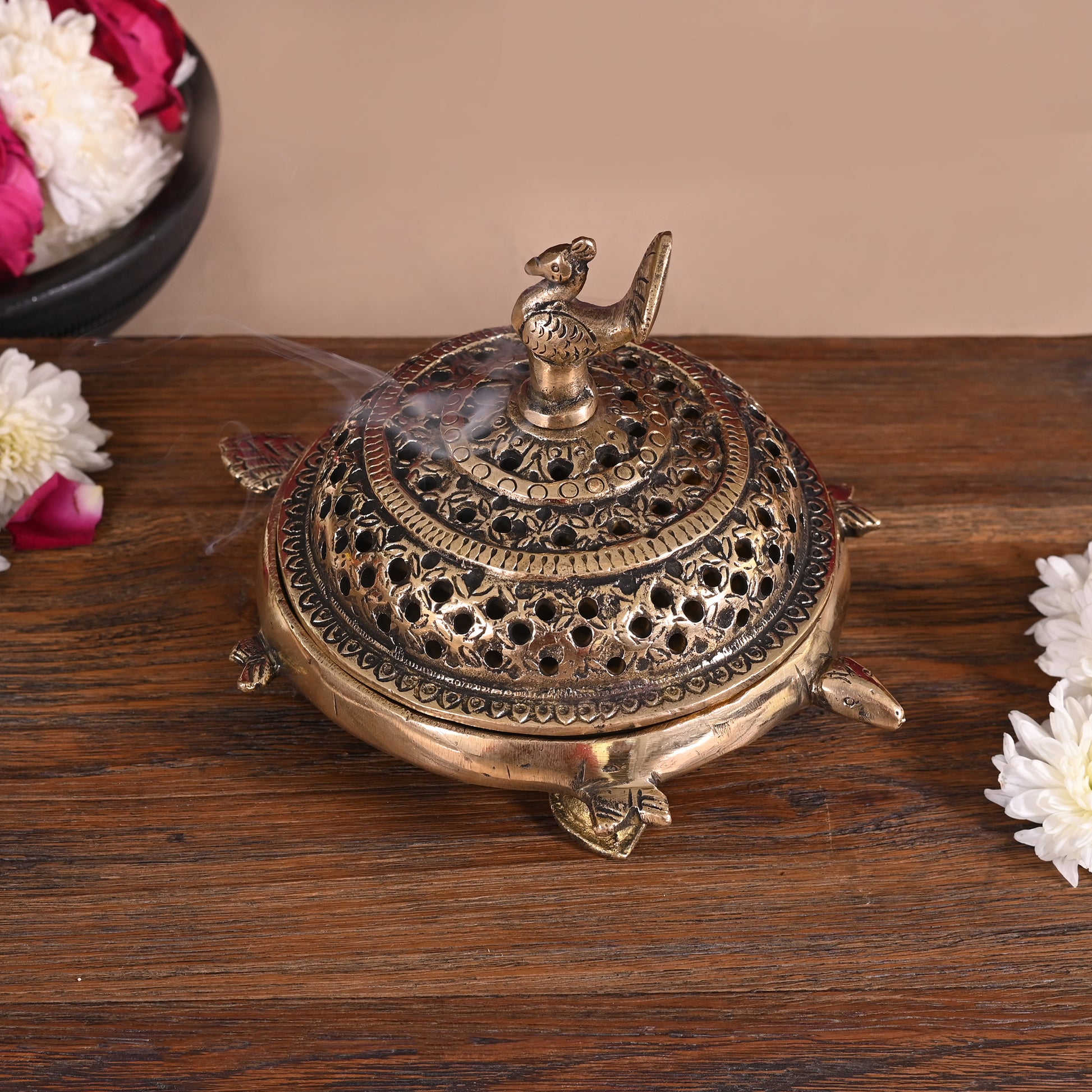 In Hindu culture, burning of dhoop is regarded as worship of the deity . Incense is burned to symbolize devotion to God during Puja, Havan, or any ceremonial worship. This ornate Brass Dhoopdani from Suyogaḥ is ideal ideal for burning camphor or loban during your daily worship.