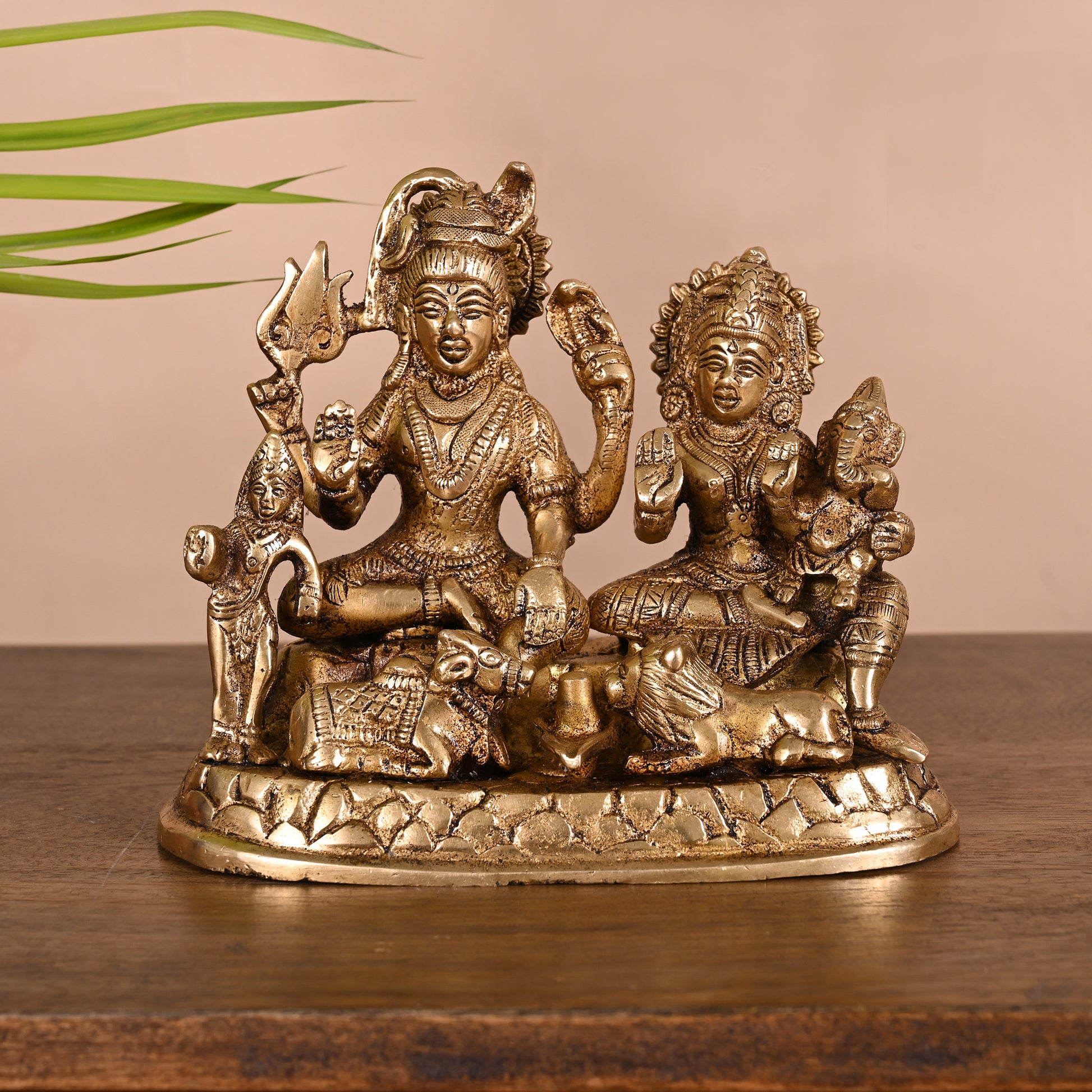 Lord Shiva is renowned as the slayer of all evil and is the greatest renouncer. This handmade brass statue of Shiva and his family, popularly known as the Shiva Parivar, will exude vitality in your home space. The rich workmanship on the idol makes it an appealing table op accent. It is belived that having a shiv parvati ganesh murti in your house helps to build relationships. So take home this beautiful brass idol from the collection of vand pray together for the well being and growth of your family. A wonderful complement for your temple.